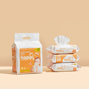 Hoppi Antibacterial Wipes are your germ-fighting heroes designed to kill 99.9% of germs. Suitable for hands, toys, and surfaces, they're gentle and alcohol-free. Additionally, these wipes are designed to be softer, thicker, and larger than the average baby wipes on the market, providing you with a cloth-like experience. Now you can clean more with just one wipe!