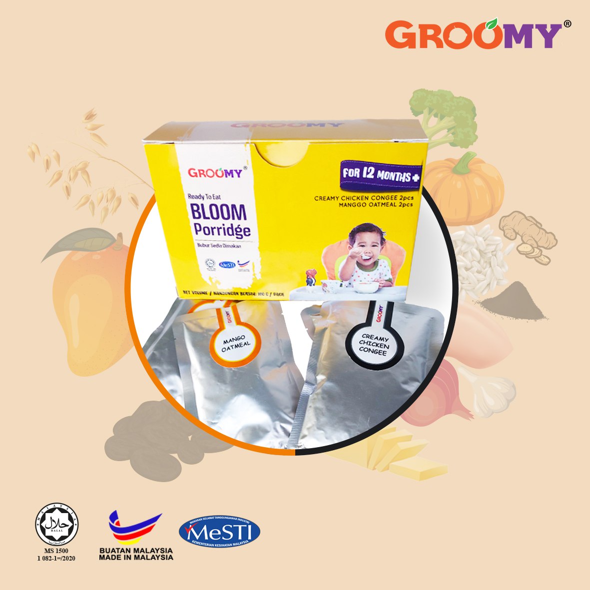 Ready-To-Eat BLOOM Porridge comes with 2 flavors in a single box: Chicken Congee (2 pcs) and Mango Oatmeal (2 pcs). It is suitable for children aged 1 year and above. 400 g (1 pcs = 100 g), expires in 2 years.