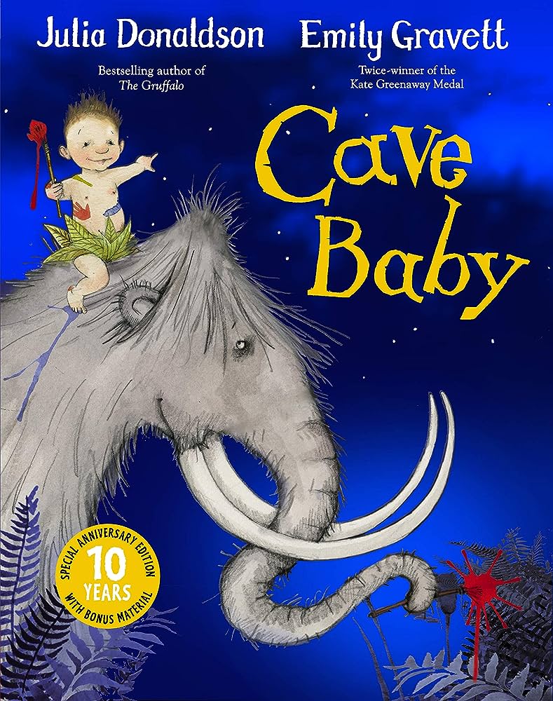 A hairy mammoth takes a cheeky little baby on a thrilling ride through a moonlit landscape populated by a sabre-toothed tiger, a leaping hare, a laughing hyena and even, just maybe, by a big brown bear....