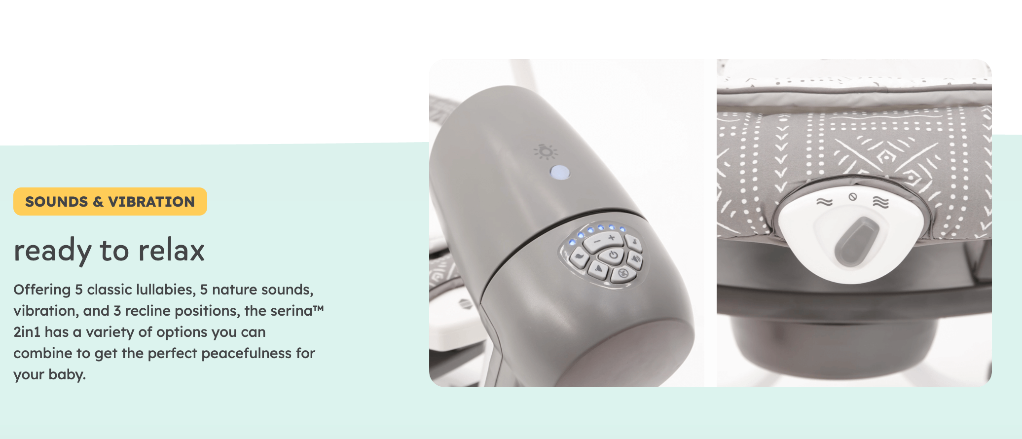 - Six swing speeds, two vibration settings, and soothing nightlight