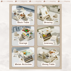 Versatility: The multifunctional desk and chair set offers a wide range of uses, including drawing, playing with blocks, eating, learning, and storage. It can adapt to various activities and needs, making it a versatile and practical furniture piece for children.
