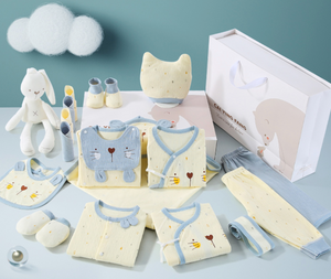 The newborn clothing set is a practical and convenient package of essential clothing items for newborns. This product typically includes a variety of comfortable and soft garments such as onesies, pajamas, hats, socks, soft toy, and mittens, all designed to be gentle on a newborn's delicate skin. The clothing set usually comes in a variety of designs and colors, making it easy to choose a style that suits the parents' preferences. With this product, new parents can provide their newborn with a complete and comfortable wardrobe, making it a great gift for baby showers, newborn/ full-moon celebration, or other special occasions.