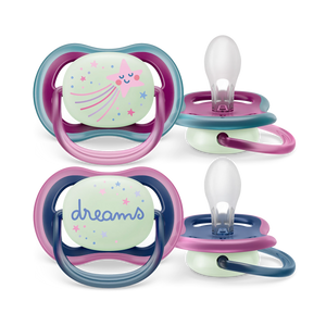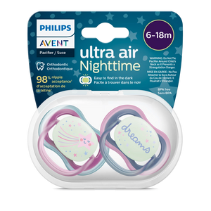 Soothe with the comfort of air. The Philips Avent ultra air has extra-large holes to keep skin dry. It has a glow-in-the-dark button so you can see it when the lights are out. Available in various colors and designs.