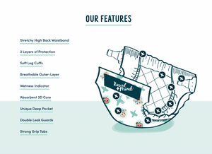 Rascal + Friends premium unisex nappies are made with no nasties, without compromising that all important performance. With no latex, lotions, fragrances, and only water-based inks, Rascal + Friends nappies are gentle on babies' delicate skin. Designed with premium features, all to help prevent sneaky leaks (and big explosions) - our nappies will help to keep your rascal dry all night and comfy all day!
